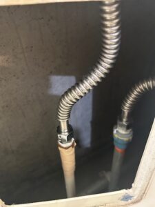 店舗を管理されている会社の担当者様からご依頼を頂きました。厨房内で水漏れがあるそうで、原因の調査と修理をご希望でした。どこから漏れているのかはわからないそうですが、床面に水溜りができる状況のようでした。お店の開店前の1時間しか立ち入りができないようで、時間が足りなければ翌日に持ち越してくださいとのお話でした。少し早めにお店に到着して待機しつつ、開店時間のきっちり1時間前にご挨拶して厨房内を見させて頂きました。給水管や排水管が密集している場所を一つずつ点検して周りました。ステンレスのダクトの中から数滴の水が垂れてきているのがわかりましたので、ダクトのフタを開けてみることにしました。しかし、フタには棚が取り付けられていましたので、棚を取り外すのに時間がかかってしまいました。天井から降りてきている給水管との接続部分からの水漏れの様でした。フレキパイプで接続されていましたので、接続部のフレキパッキンを新しい物に交換して再度通水確認をしてみましたが、漏れは止まりませんでしたので、フレキパイプの交換にて修理を行うことに決まりました。お店の開店時間が迫っていましたが、開店直後に忙しくなるわけではないそうで、時間オーバーしてもいいと許可を頂けましたので、新しいフレキパイプにて接続し直して、通水して漏れがないことを確認し、ダクトのフタと棚を組み立て直して、何とか一回の訪問にて修理を完了することができました。