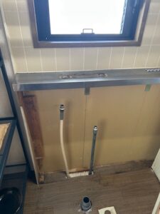 本日は、飲食店で起きた給水管の水漏れトラブルについて、ユニット取り出し金具の交換作業による修理の事例をご紹介します。葵区の飲食店様から水漏れ修理のご依頼を頂きました。シンク下の配管で、複数個所から水漏れしているというお話で、修理をご希望でした。シンク下の止水バルブを閉めると水漏れは止まるので、現在はそこで止水している状況のようでした。仕込み専用に使用しているシンクなのでお店の開店前の時間帯しか使用せず、この後であれば修理は何時に来ても構わないとのことでしたので、早速現場を見させて頂くことになりました。複数個所から漏れているとのことでしたが、水が漏れているのは給水フレキ管とユニット取り出し金具の接続部分の一か所だけで、漏れた水が下に垂れてあちこちから漏れているように見えていただけのようでした。シンクの下は狭く潜り込んでの作業はできないようでしたので、シンクに設置された水栓を取り外し、ユニット取り出し金具をシンク上に引っ張り上げてフレキ管とフレキパッキンの交換を行いました。通水テストを行うと、水漏れは直っていませんでしたので、ユニット取り出し金具側にも問題があると思われました。再度水栓と取り出し金具を外して、新しい取り出し金具に交換して、組み立て直しました。通水後、漏れもなく問題がないことが確認できました。取り外したユニット取り出し金具には亀裂や変形は見られませんでしたので不思議でしたが、結果水漏れは直りましたので、今回の修理は完了となりました。